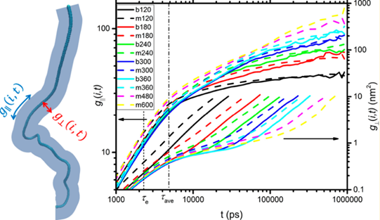 图:短链探针在共混体系中平行管道方向g||(i,t)及垂直管道方向g⊥(i,t)的均方位移随时间t的变化。