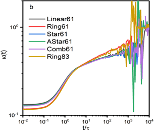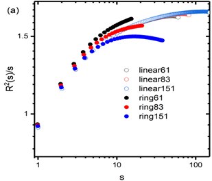 图:(a)约化的均方链内距离R2(S)/S随链段数S的变化; (b)取向相关中交叉相关在总取向相关的占比K(t)随时间的演化。